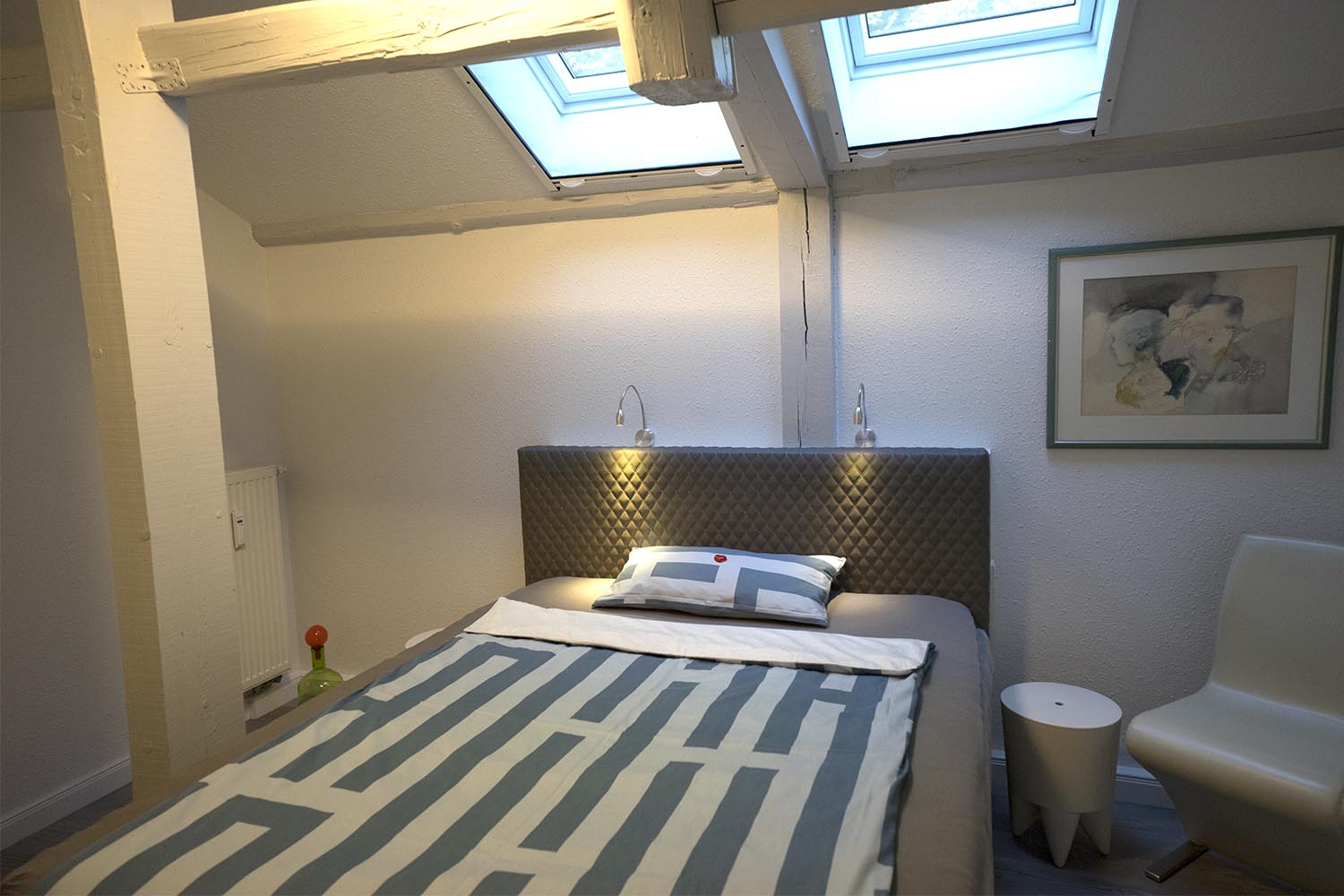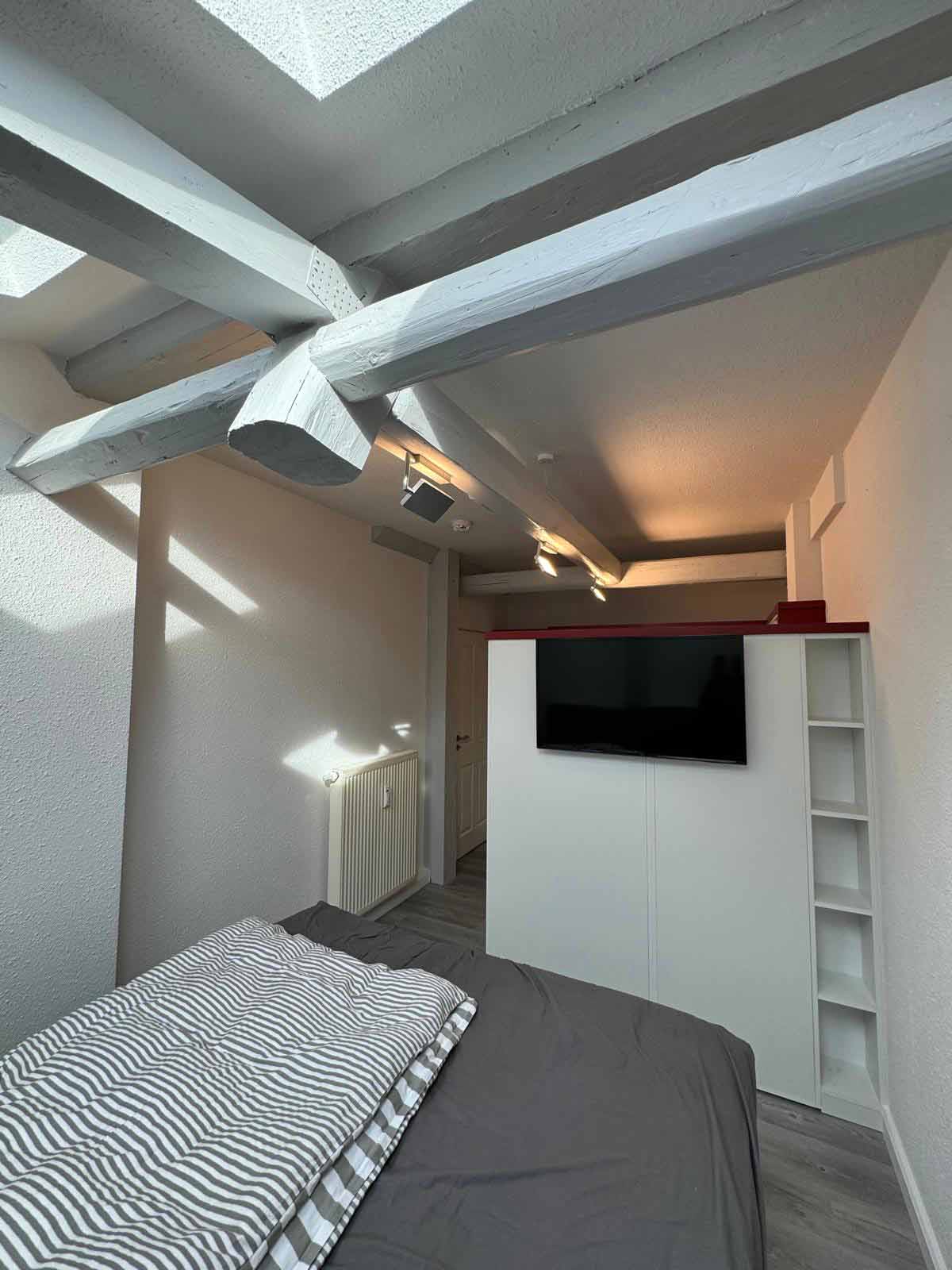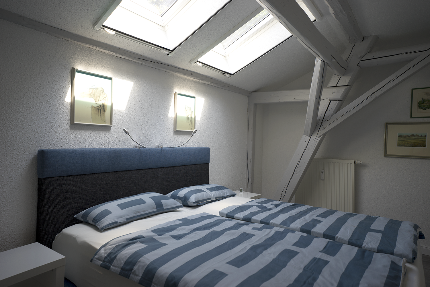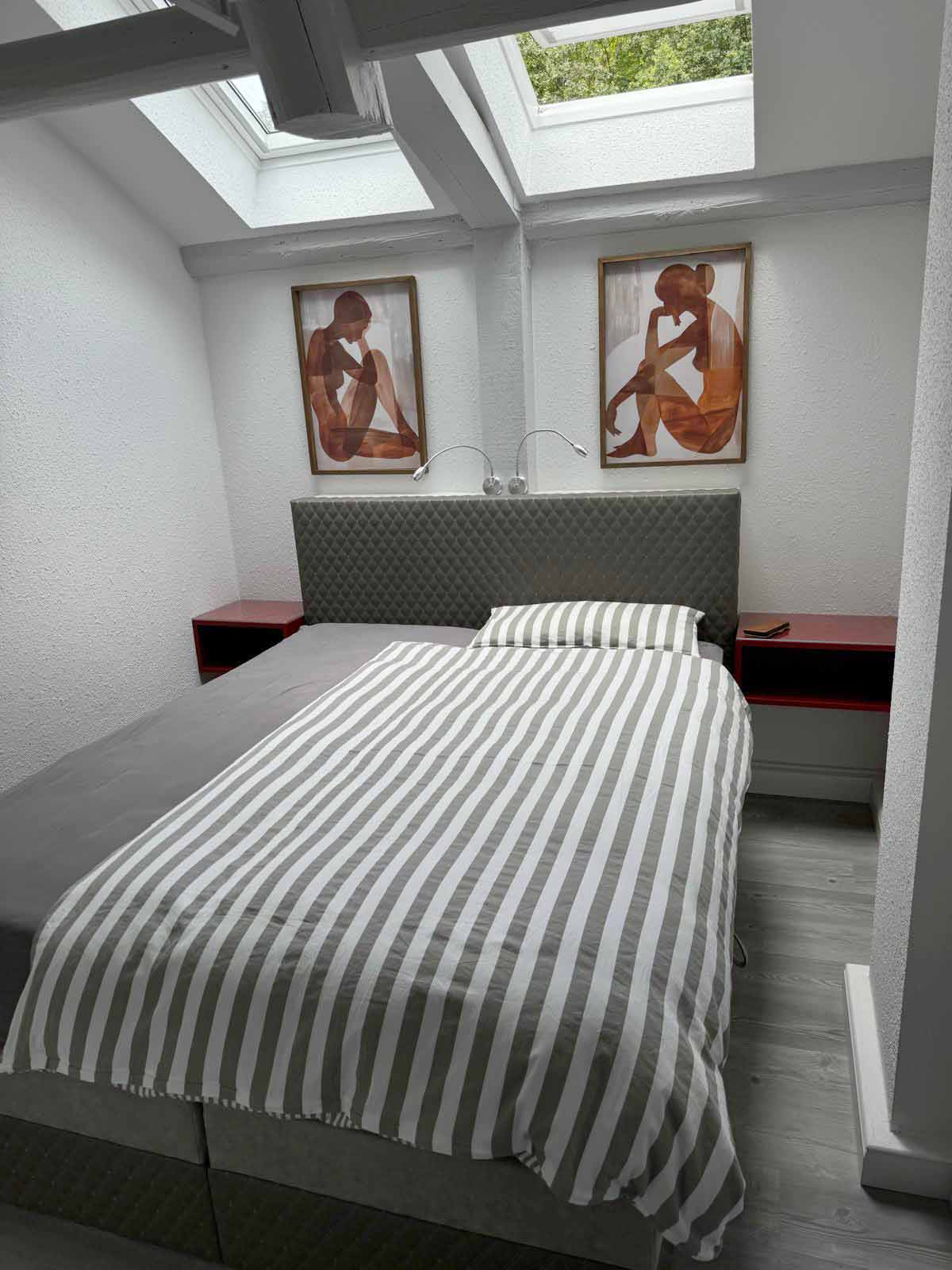 Schlafzimmer: komfortables Boxspringbett mit individuellen Leseleuchten, reichlich Schrank- und Stauraum, Dachfenster mit Fliegenschutzgitter