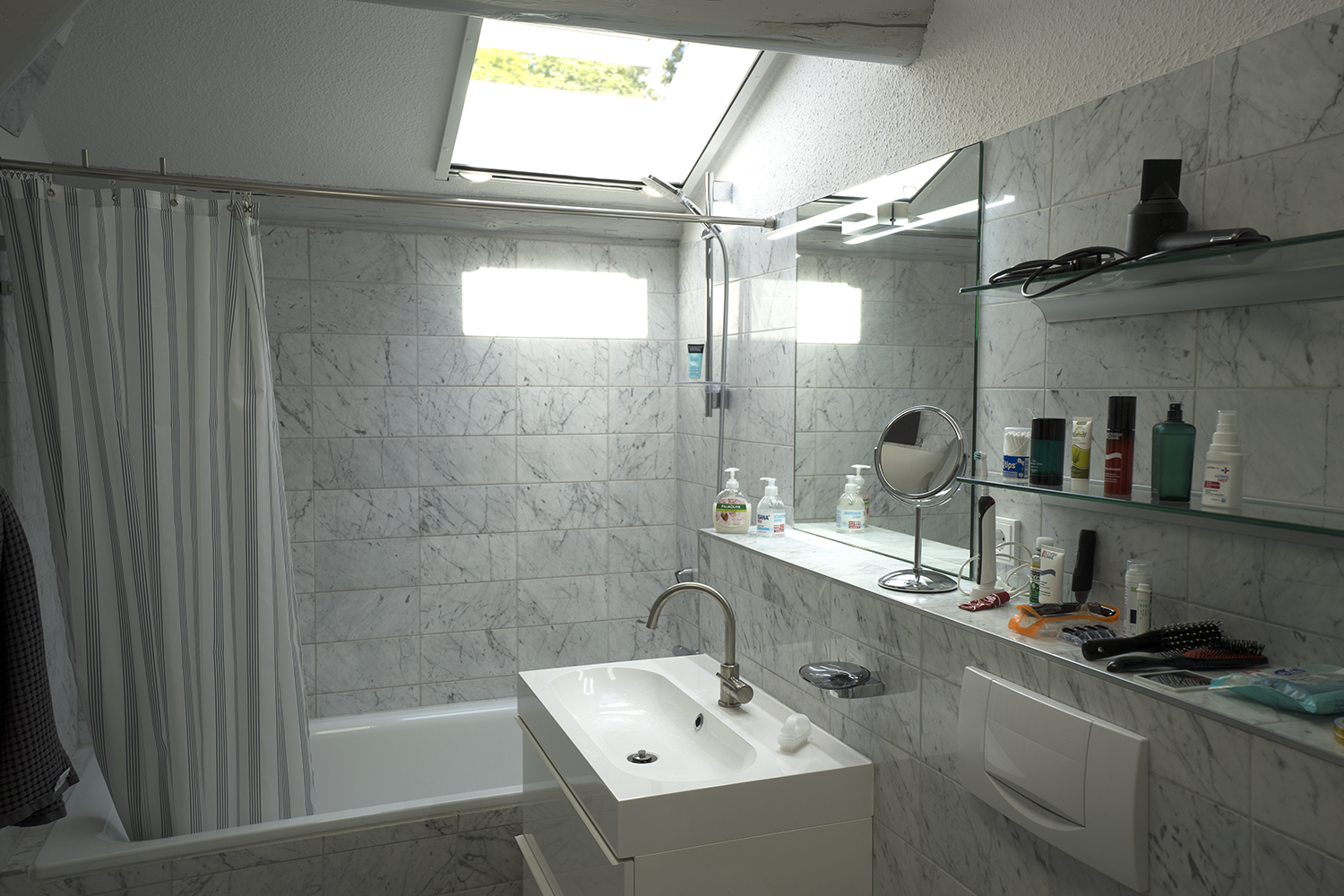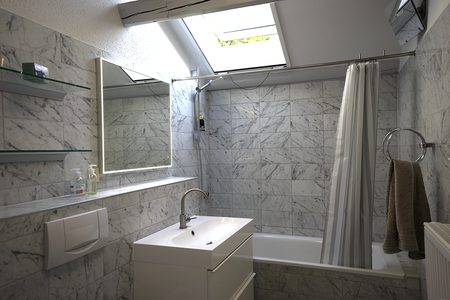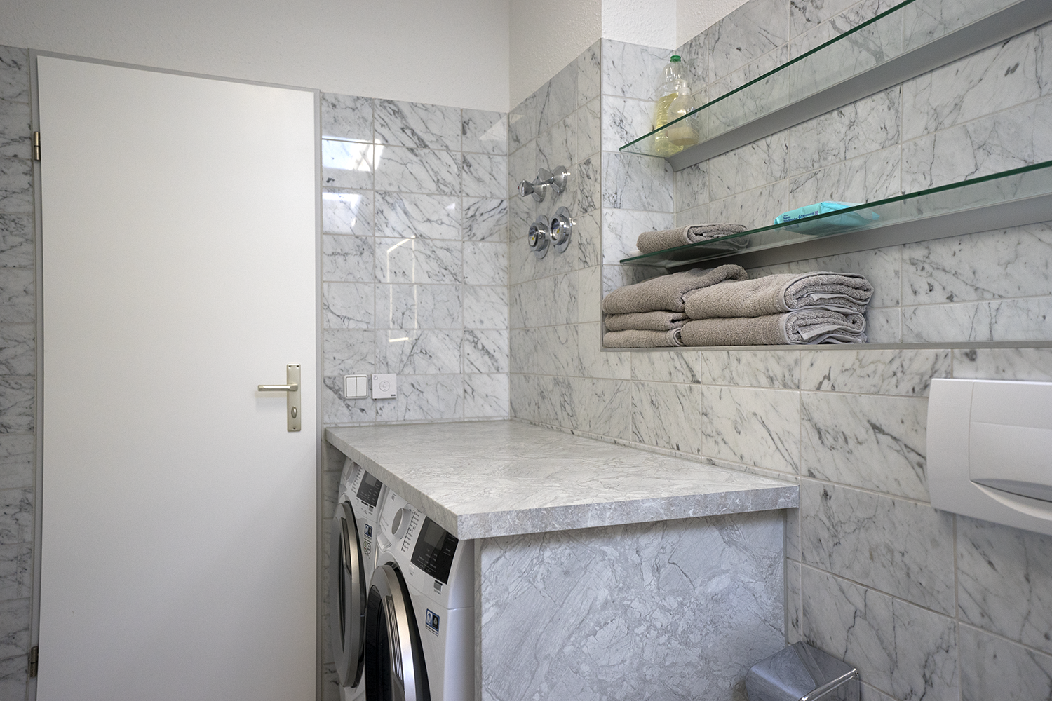 Bad: Marmorbad, Badewanne mit Thermostatbrause, Großer Waschtisch, Toilette, Waschmaschine, Trockner, beleuchteter Spiegel, reichlich Ablagen, Föhn, Personenwaage