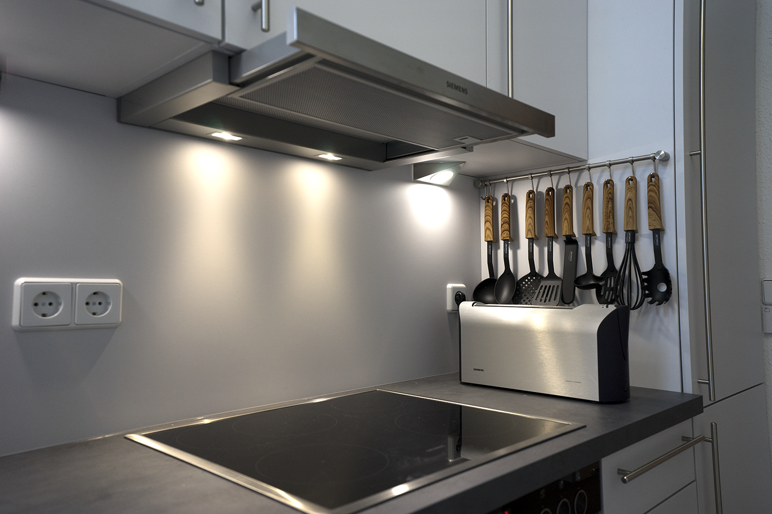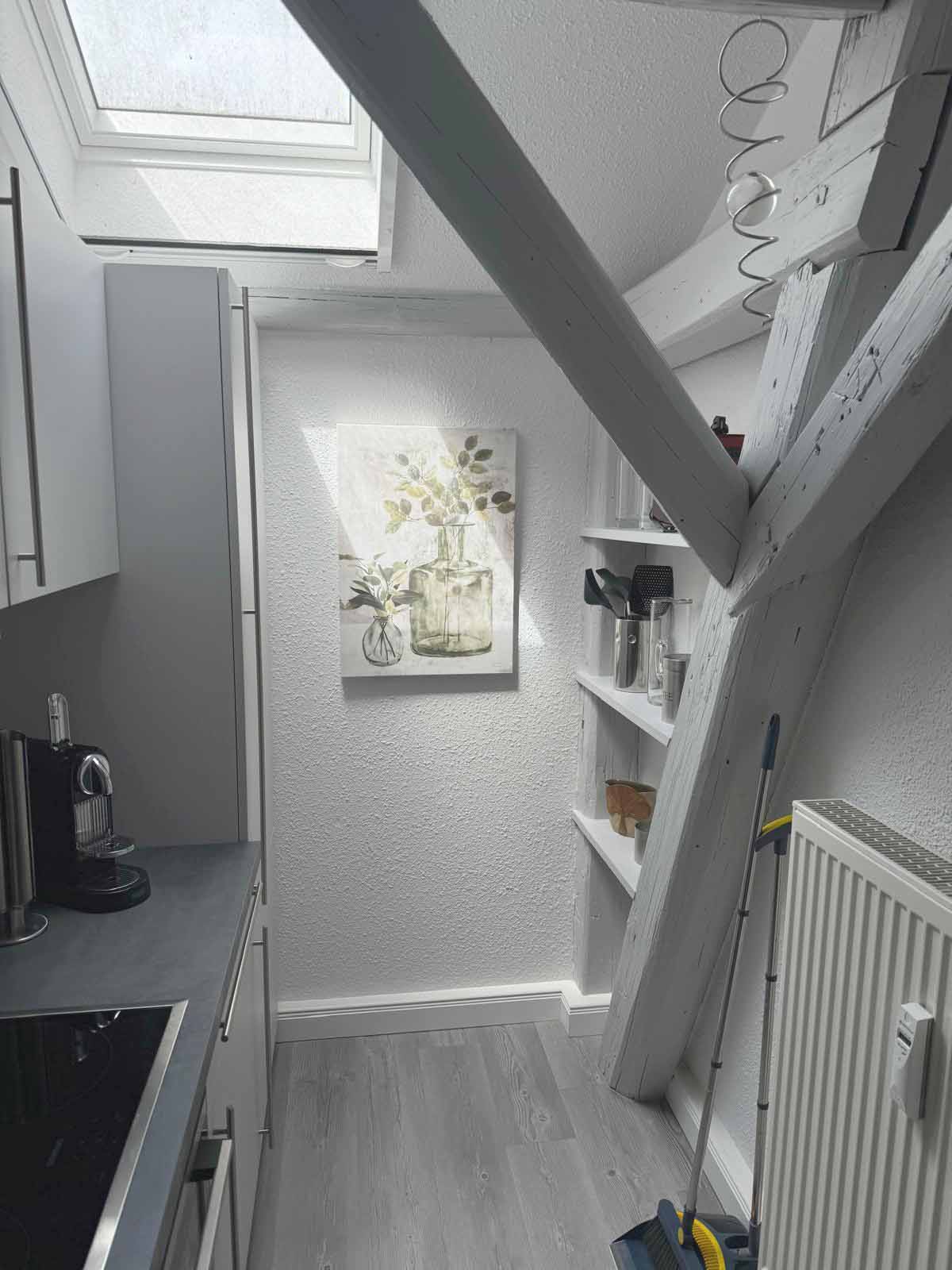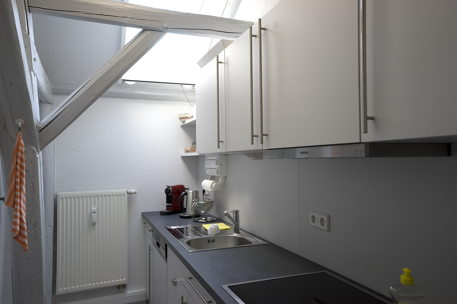 Neue Küche: Esstisch für 4 Personen, großer Kühlschrank, Induktionsherd mit Backofen, Dunstabzug, Geschirrspüler, Nespresso Maschine, Wasserkocher