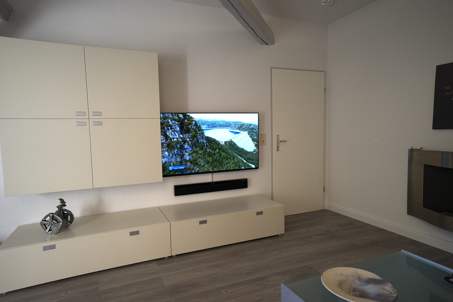 Wohnraum: Esstisch für 4 Personen, Schlafcouch (für dritte Person), Wandschrank, TV-Kommode mit Flachbild-Fernseher, Kabel - TV, W-Lan