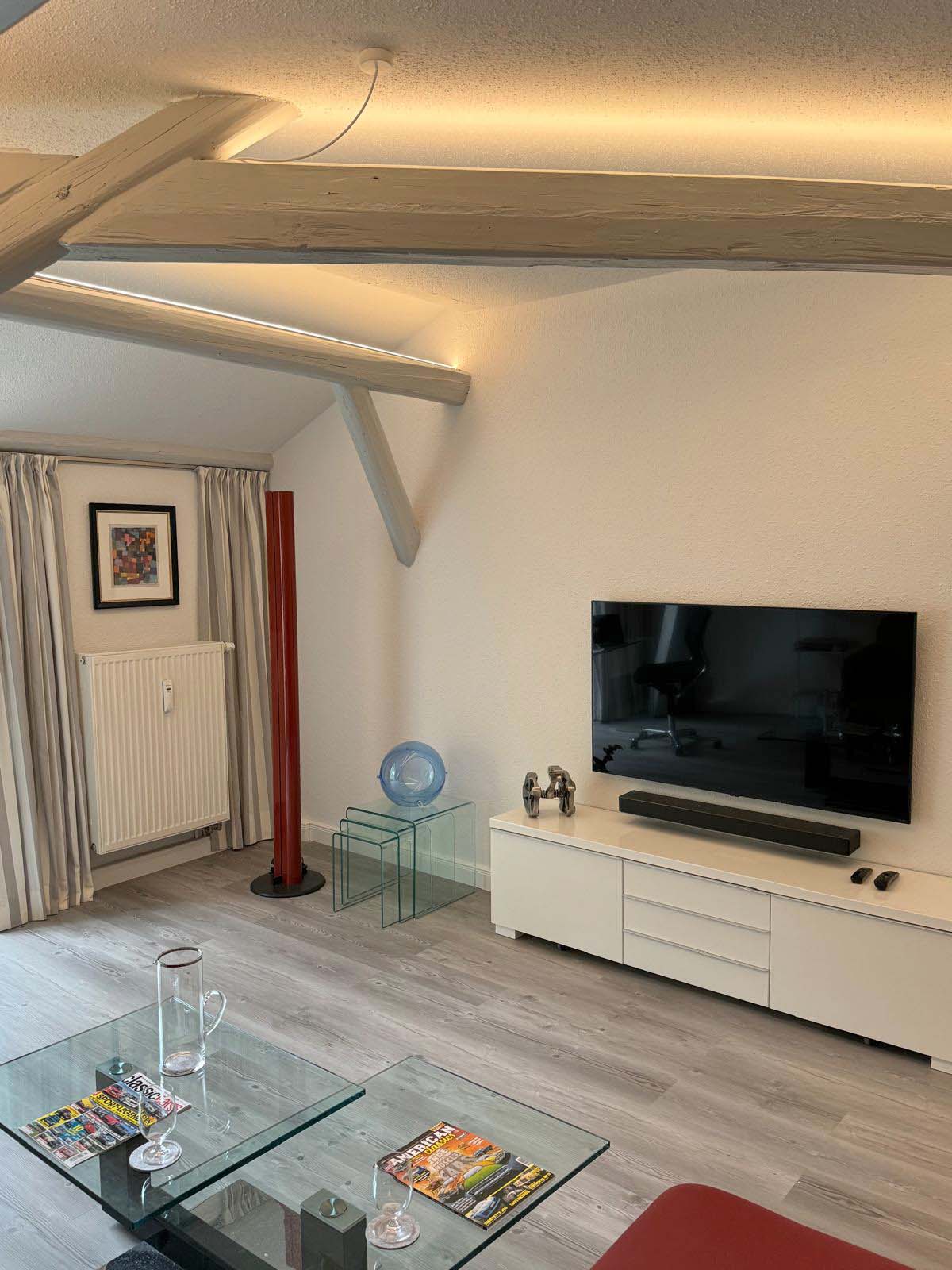 Wohnzimmer: mit Ausblick auf das Stadtzentrum, große bequeme Couch, komfortabler Ruhesessel, Schrankfläche mit großem OLED - Flachbild - Fernseher, Kabel- TV, W-Lan, Dekokamin