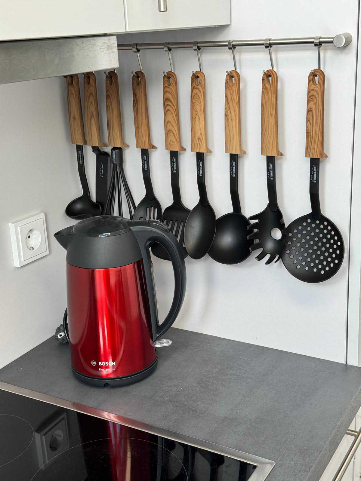 Neue Küche: großer Kühlschrank mit separatem Gefrierfach, Induktionsherd mit Backofen, Dunstabzug, Geschirrspüler, Nespresso Maschine, Wasserkocher, Toaster
