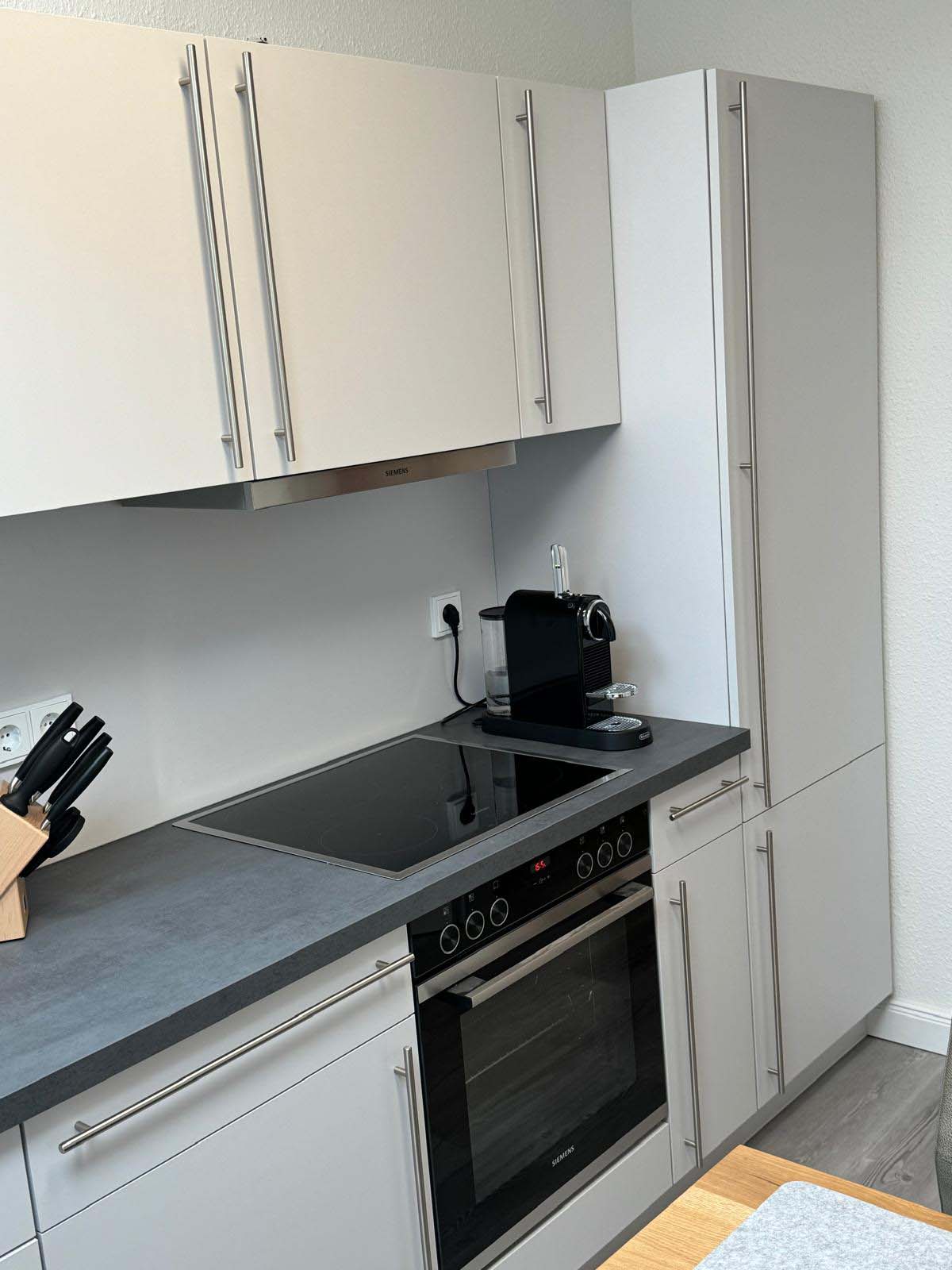 Neue Küche: großer Kühlschrank, Induktionsherd mit Backofen, Dunstabzug, Geschirrspüler, Nespresso Maschine, Wasserkocher