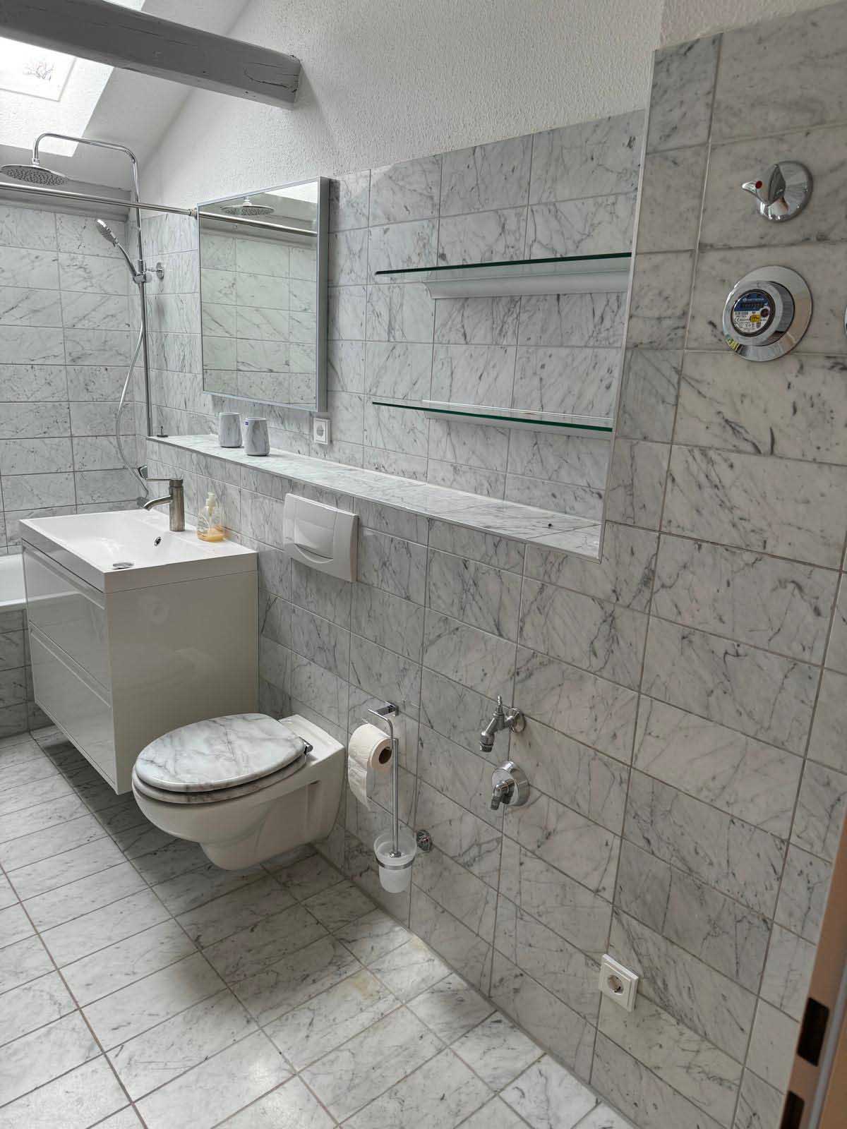 Bad: Badewanne mit Thermostat Brause, Waschtisch, Toilette, Waschtrockner, beleuchteter Spiegel, reichlich Ablagen, Personenwaage, Föhn